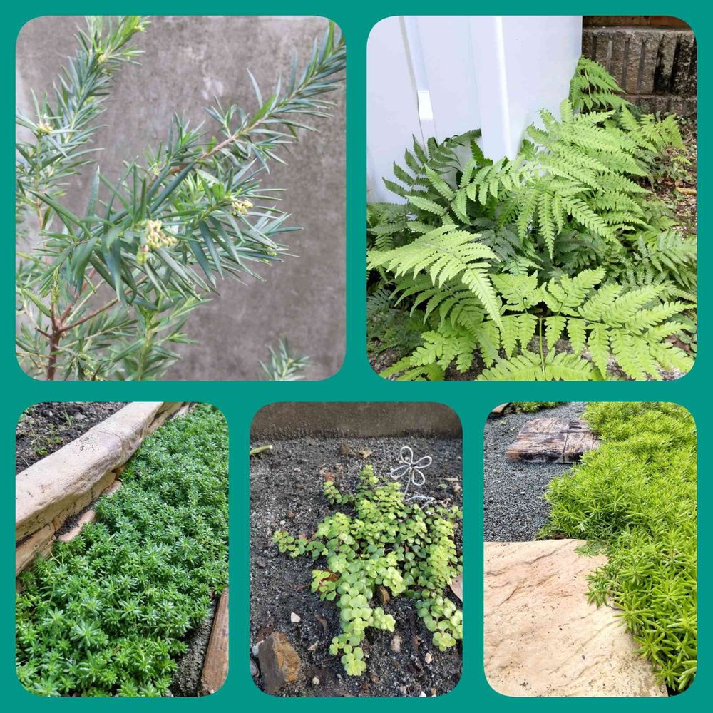 写真はそんなお庭でも頑張っているセダムたちと、植えていないのに増えていくシダ類。