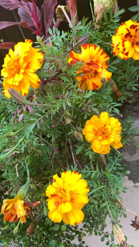 何種類かのマリーゴールドが咲きました。赤っぽいのから真っ黄色いのやら