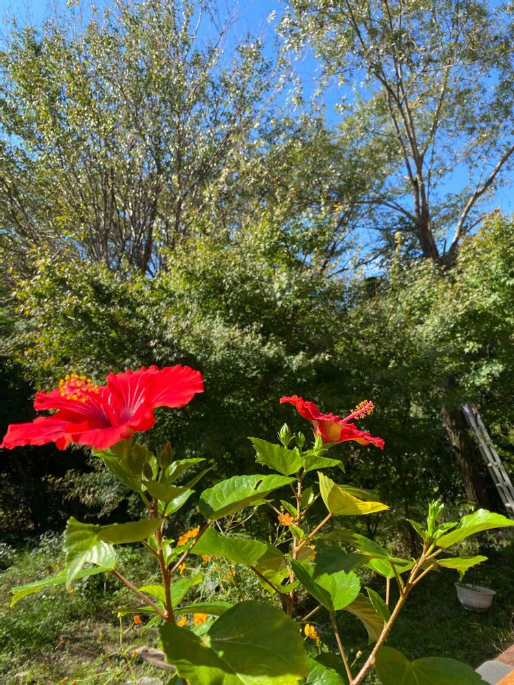 青空に真っ赤なハイビスカス🌺が上向きで咲いてる姿って、いいね😍