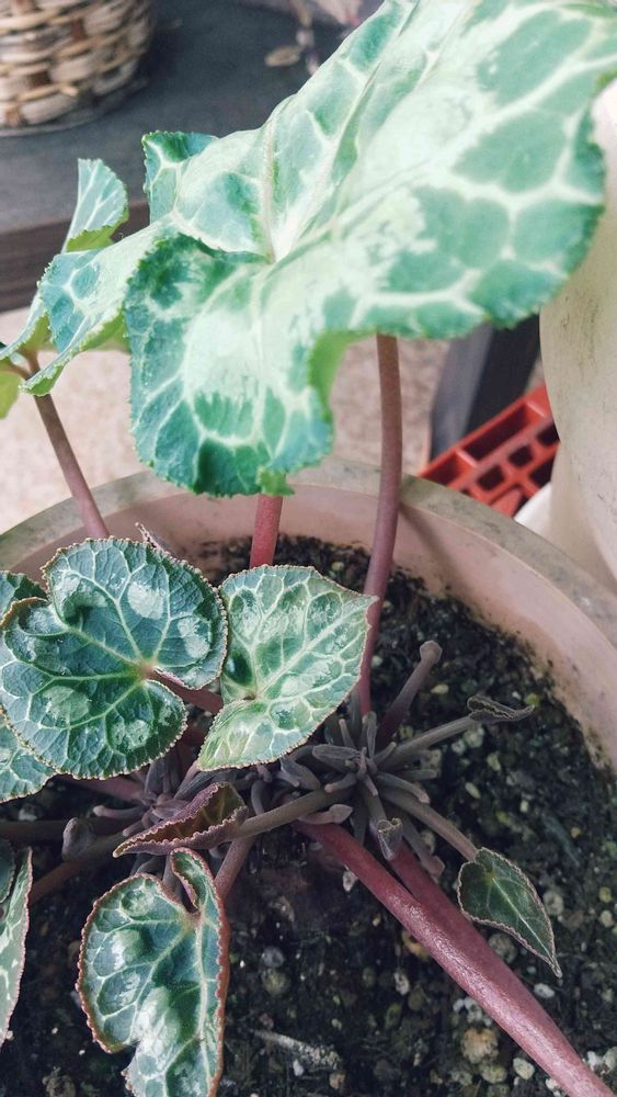 春先、そろそろ😊シクラメンが終る頃☺️お値打ち品で連れ帰りました☺️その頃と全然違う😊とてもたくましい葉が出て来ました☺️見ていただけて👌嬉しいです😆