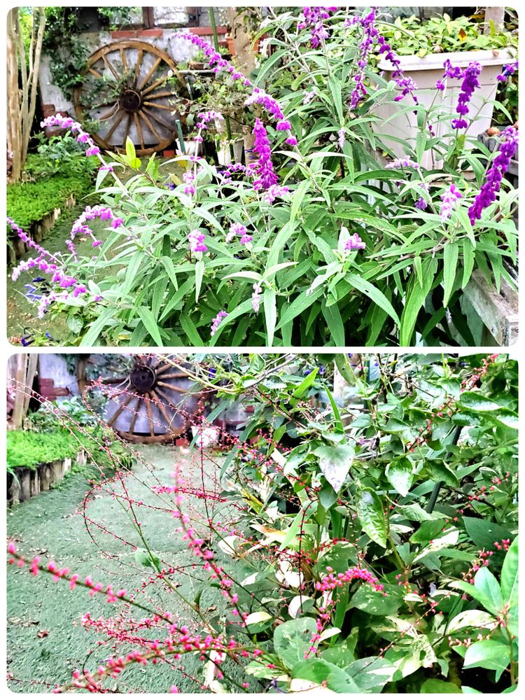 マイガーデンアメジストセージ咲いています🎵その下には赤いミズヒキが咲いています😄💕