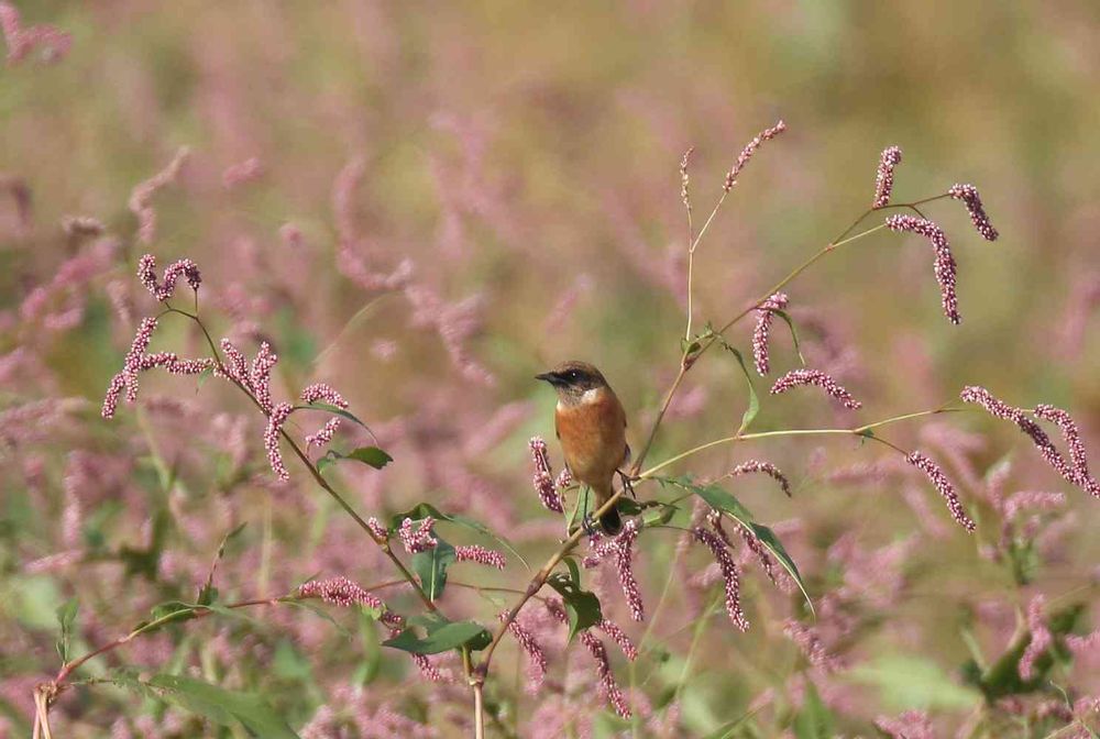 ピンクのタデさんを背景に自然のノビタキさん、まるで絵の様🖼