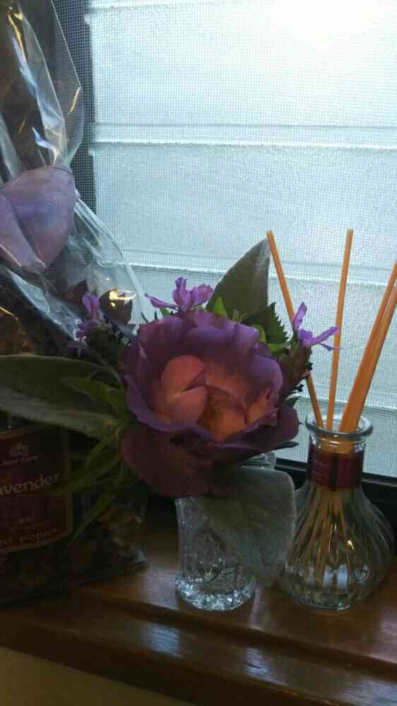 こちらはトイレに飾りましブルーフォー・ユーの色に合わせて、フレンチラベンダーとラムズイヤー。香りにレモンマートルを入れてミニブーケに。