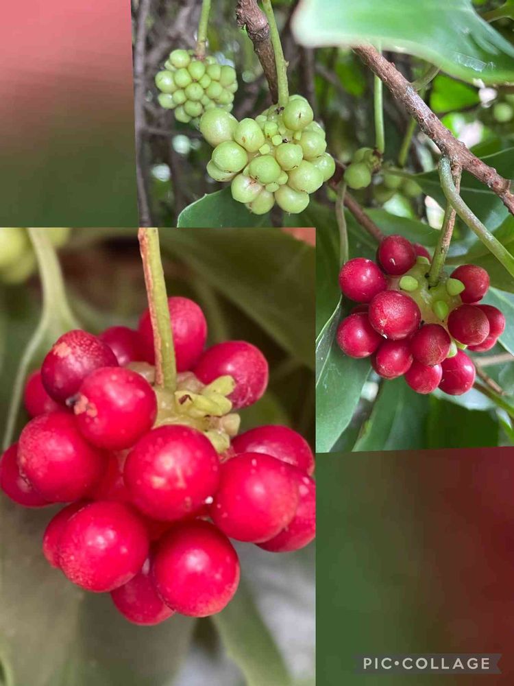 こんもりとした光沢のある濃緑色の葉の陰から、ツヤツヤした真っ赤な実がそっと顔を出していました。❣️