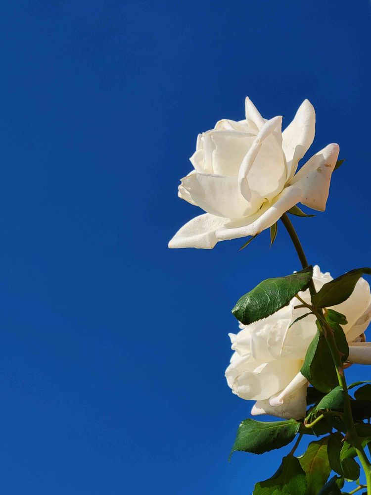 真っ青な秋空に真っ白な薔薇が映えますね!