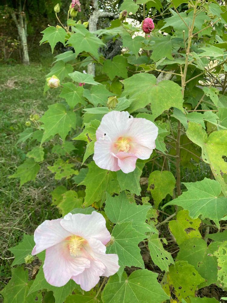 公園にて。葉っぱは、だいぶ虫さんに食べられてますが、お花は、たくさん咲いていました。ピンク色が優しい💕