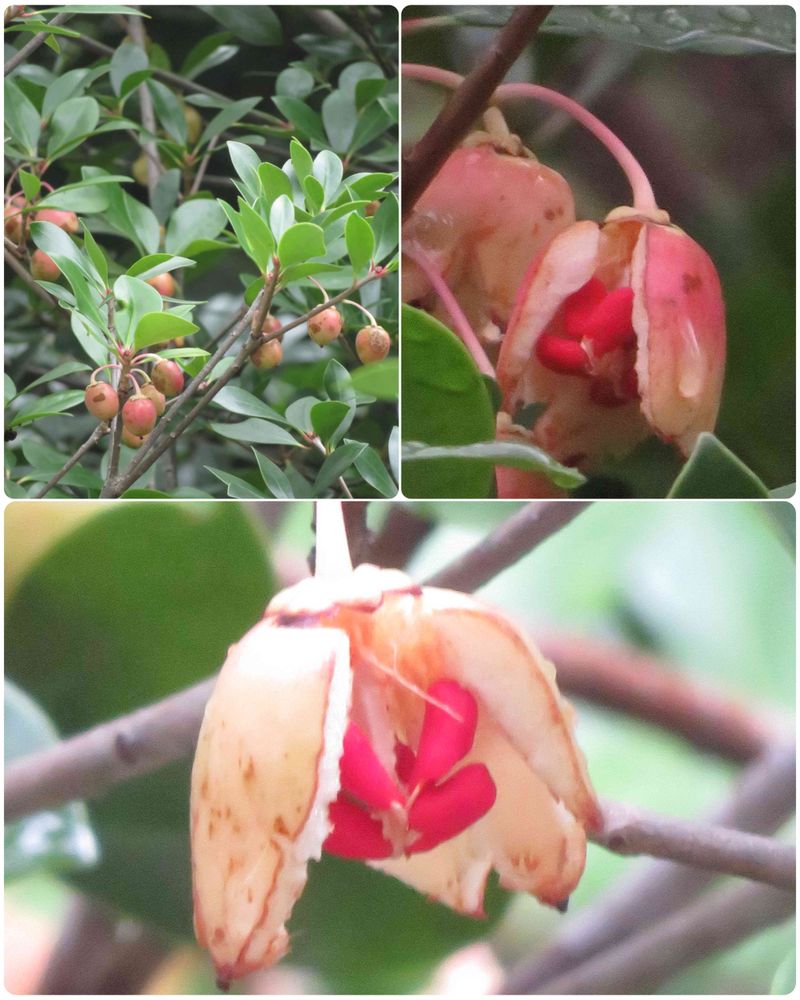 モッコク(木斛)の実が割れて赤い種が出てきました。公園で。