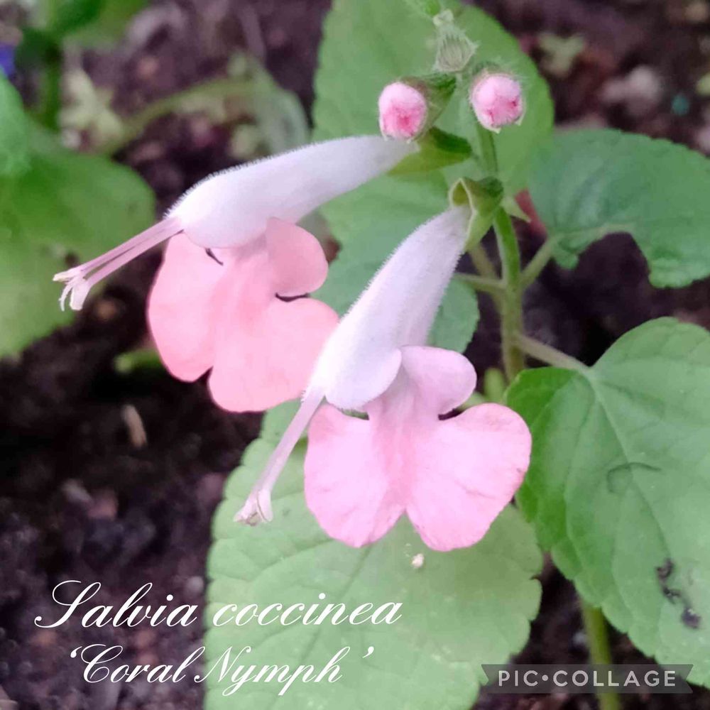 おはようございます☁😊可愛いピンクのセージ(サルビア)の苗が咲いていました🌼🎵サルビア・コクシネア・コーラルニンフと思います。花の上側が白又は薄ピンク、下側の花弁の色がサンゴ色の花で、「サンゴ色の妖精🧚」という名に相応しい姿です😍ハーブで知られるセージは宿根性のサルビアで 南ヨーロッパの地中海沿岸に多い多年草です。暑さには強いが寒さには弱く、戸外越冬には霜に当てない・凍結しない条件が必要です。