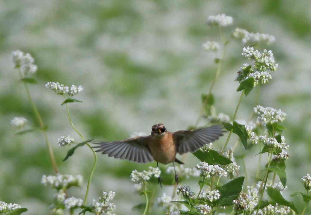 ソバのお花とノビタキさんが羽根をいっぱいに広げたホバーリング姿、