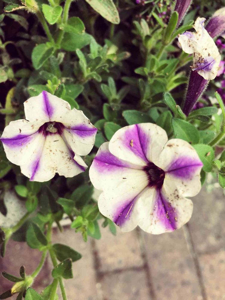 自宅の玄関先で、白い花に紫の縦縞が入って、可愛い花を咲かせました☺️
