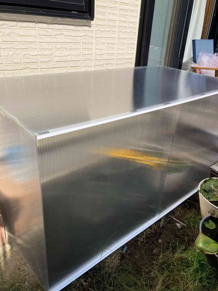 去年迄はホムセンの簡易ビニールの奴にいれてましたが、紫外線劣化で結局ビニールは一年しか持たないしフレームのプラも折れるしで苦肉の策です(о´∀`о)