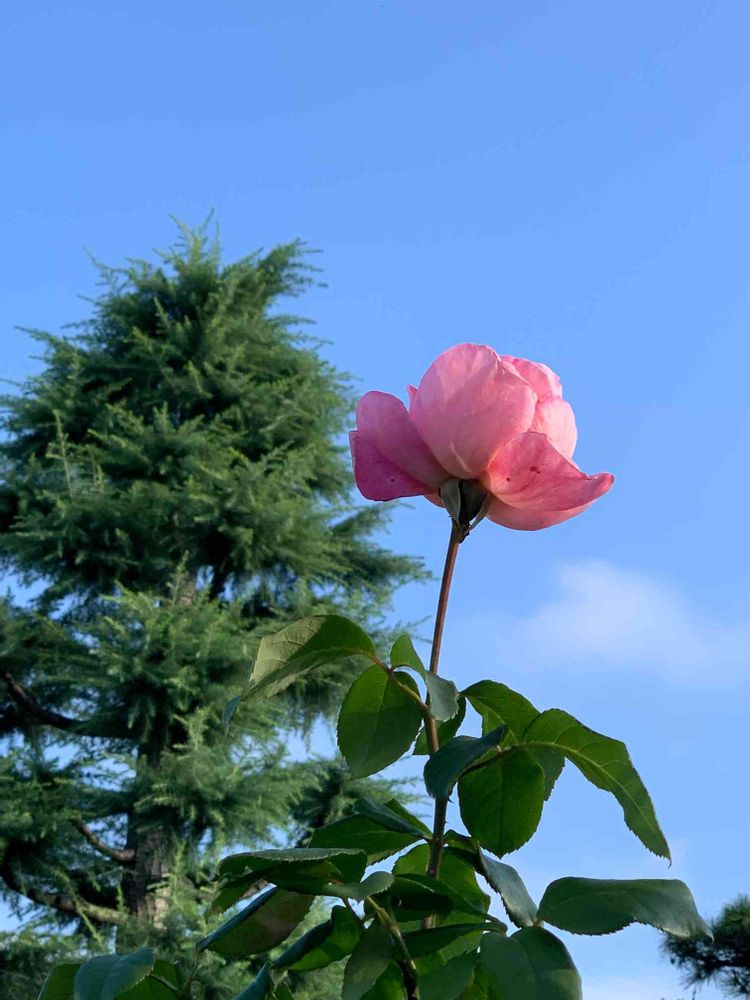アーチの頂上から空に向かい咲きました。秋晴れ、でも朝晩の最低気温は4℃、寒くなりました🌿ガーデニングには忙しい秋シーズン、そろそろ冬の準備もしなければ💦