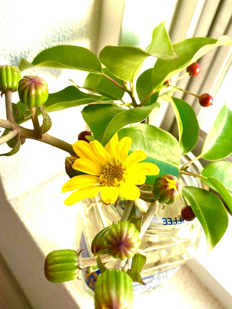昨日のツワブキとソヨゴの実をちょっとずつ摘ませて貰い、職場の給湯室の窓辺に♪