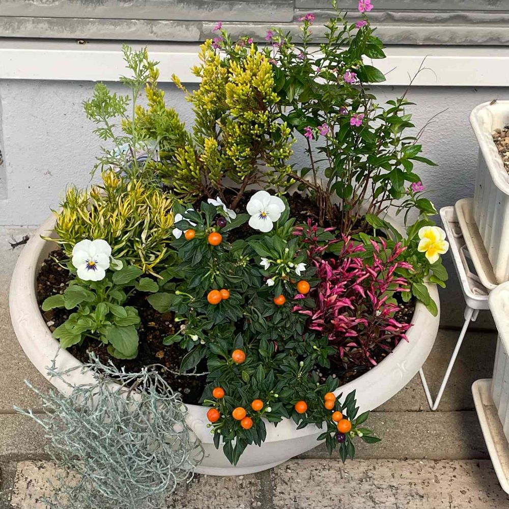 残ったパンジーを中心に、冬〜春用の寄せ植え第1弾。