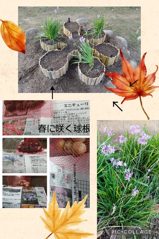 春咲き球根のサ―クル作って貰いました。🍀形に、植えました。①ミニチュ―リップ(赤)②釣鐘草(ピンク色)③カラフルスターフラワー(白、ピンク、ブルー)④スプリングビューティ―(ブルー)