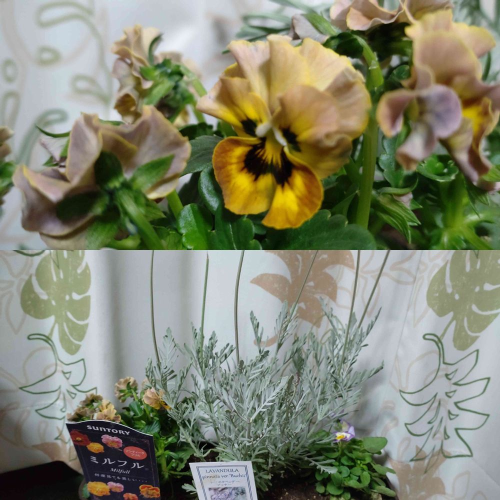 寄植えでミルフルアンティークフリル、レースラベンダーブッチー、ノーブランドビオラを合わせてみました。やっとミルフルGET!