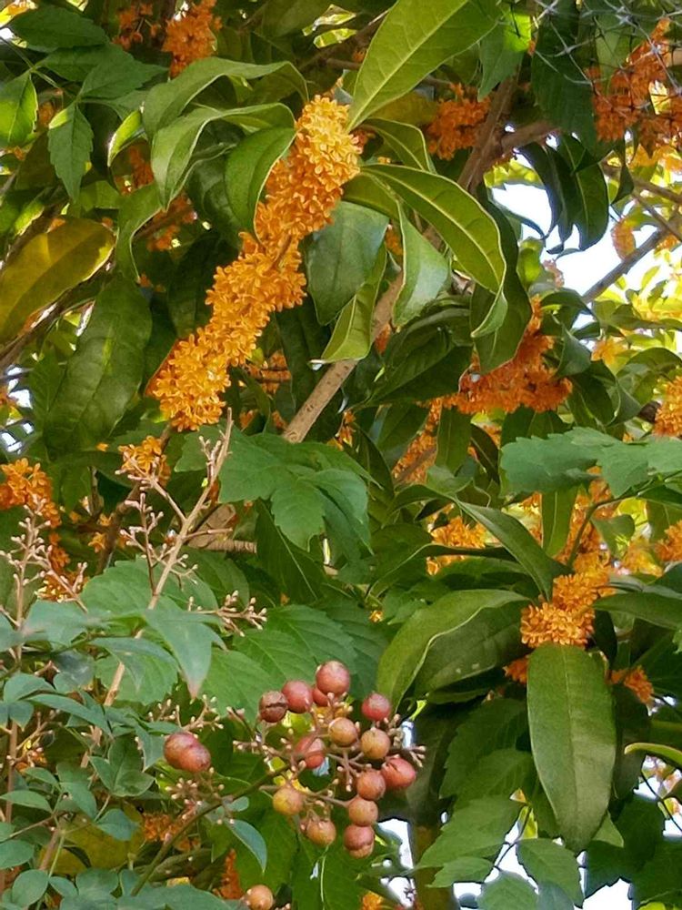 通りすがりの、とあるお宅のキンモクセイ(金木犀)の花と、南天の実☺️