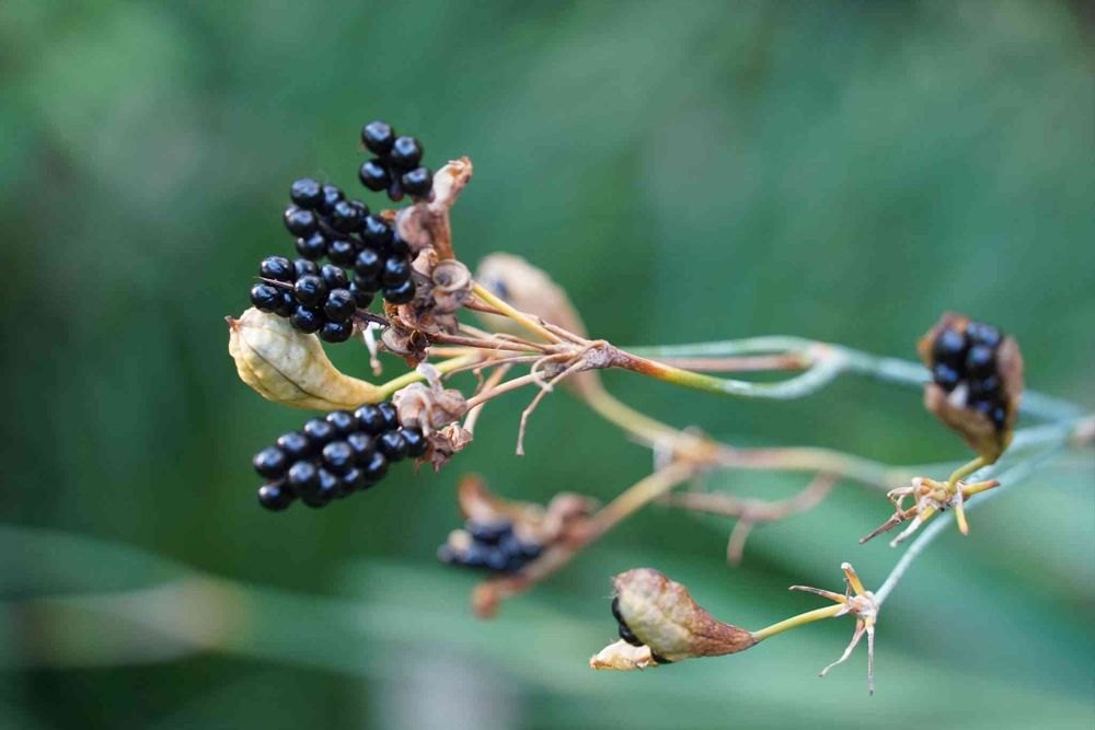 ヒオウギの花の種。真っ黒で艶があり、その美しさで「ぬま玉」と呼ばれるそうです。「ぬば玉の」は、古典の和歌の世界では「黒髪」や「夜」にかかる枕詞で、それはこの種の美しさから来ているようです。