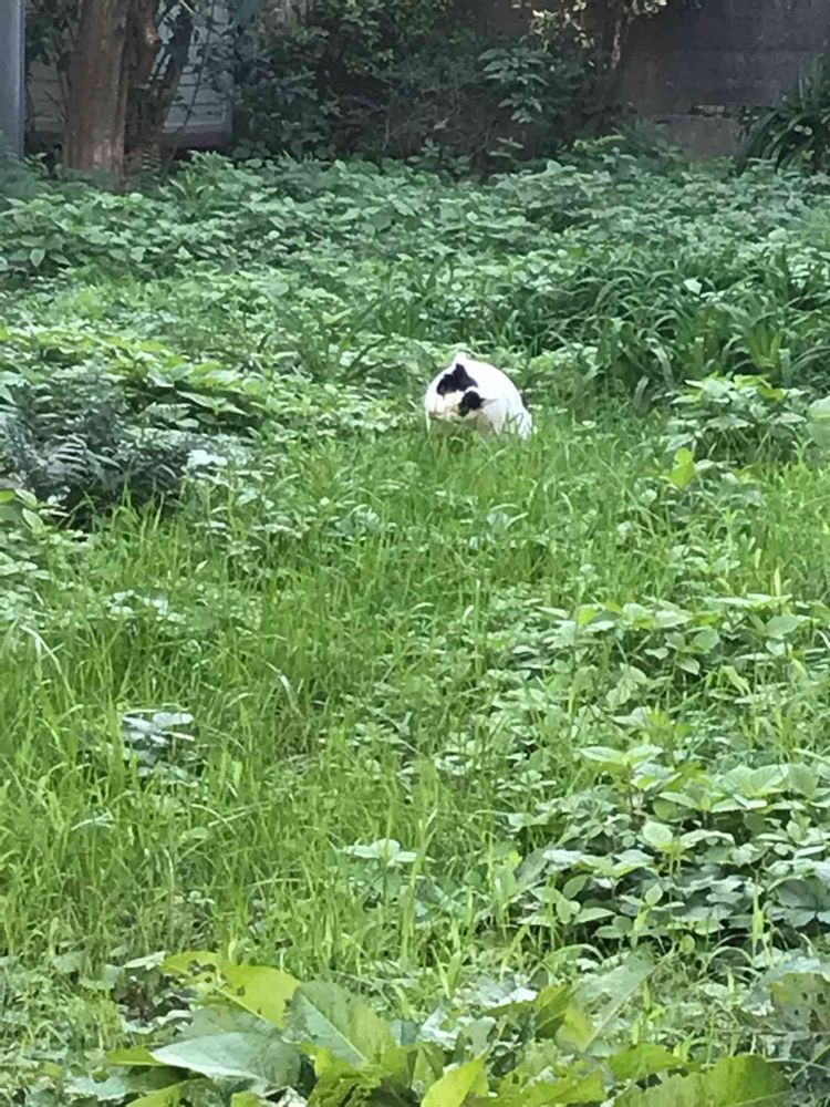 散歩の道沿い。草茫々の裏庭で、猫が草を噛んでいます。ネコ草の代わり?この家の猫らしく、呼ばれて返事していました。