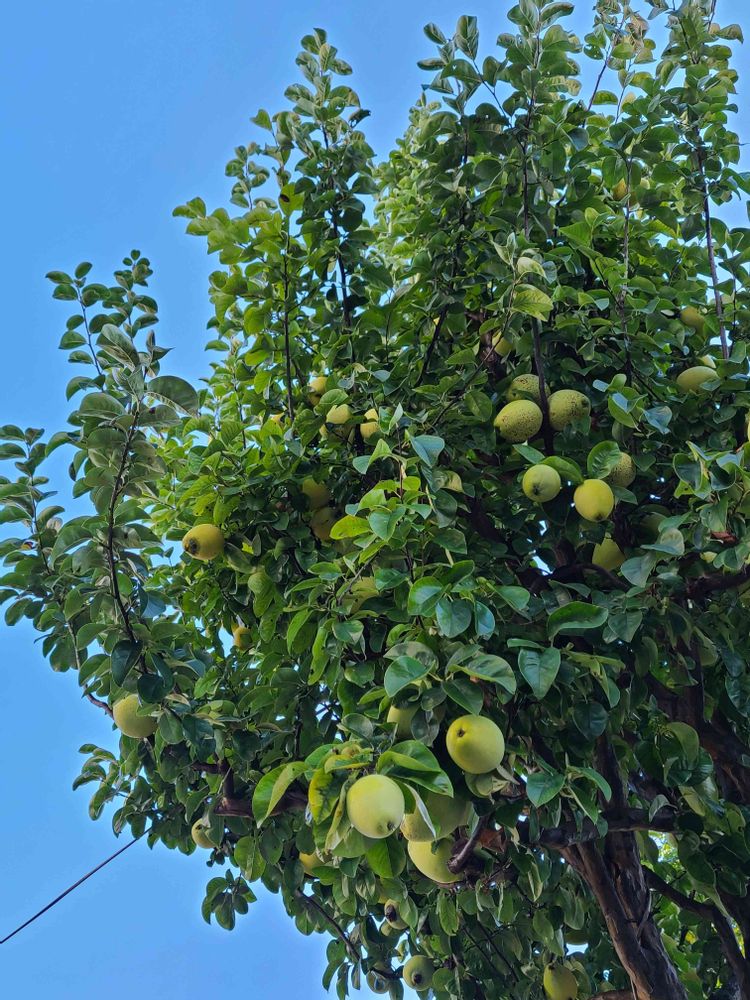 青空にたくさんの実を着けているカリンの樹木に出会いました☺️