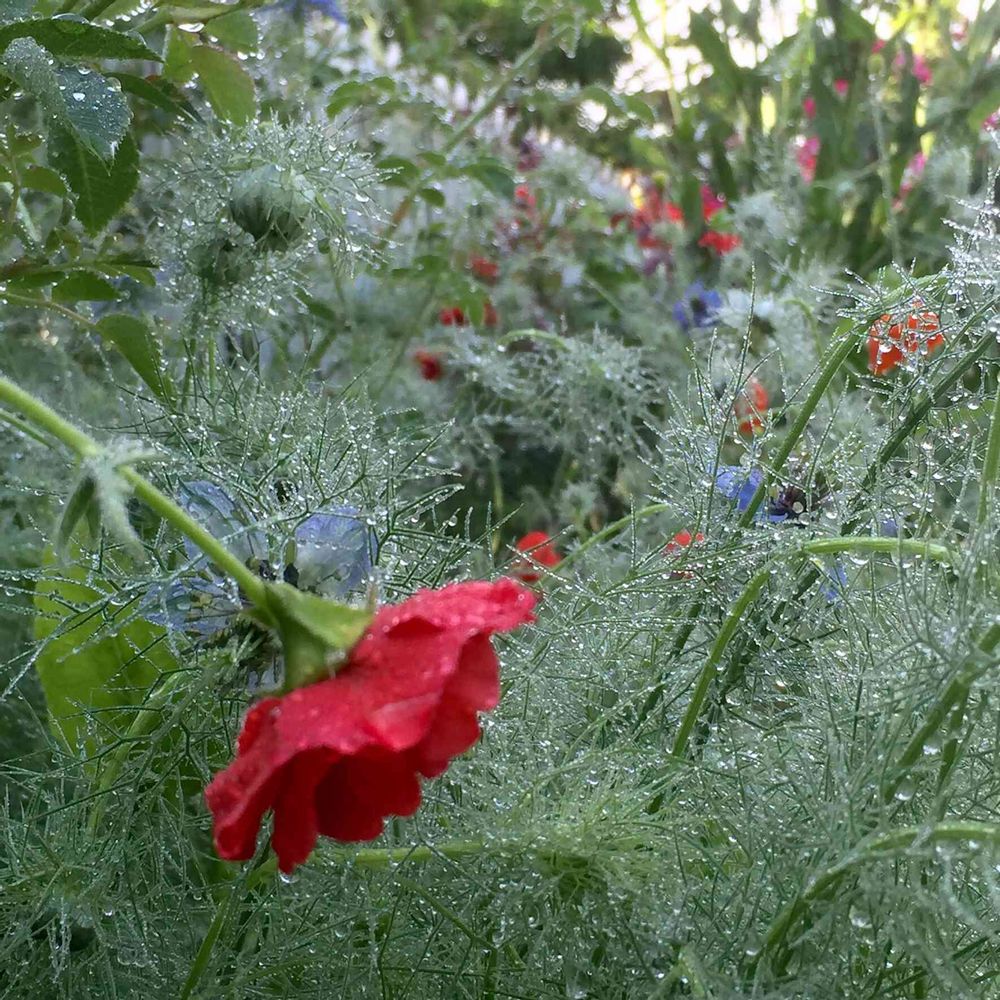 ニゲラの細かい葉っぱが雨粒を絡め取ると、こんな感じになるんですね(^^)