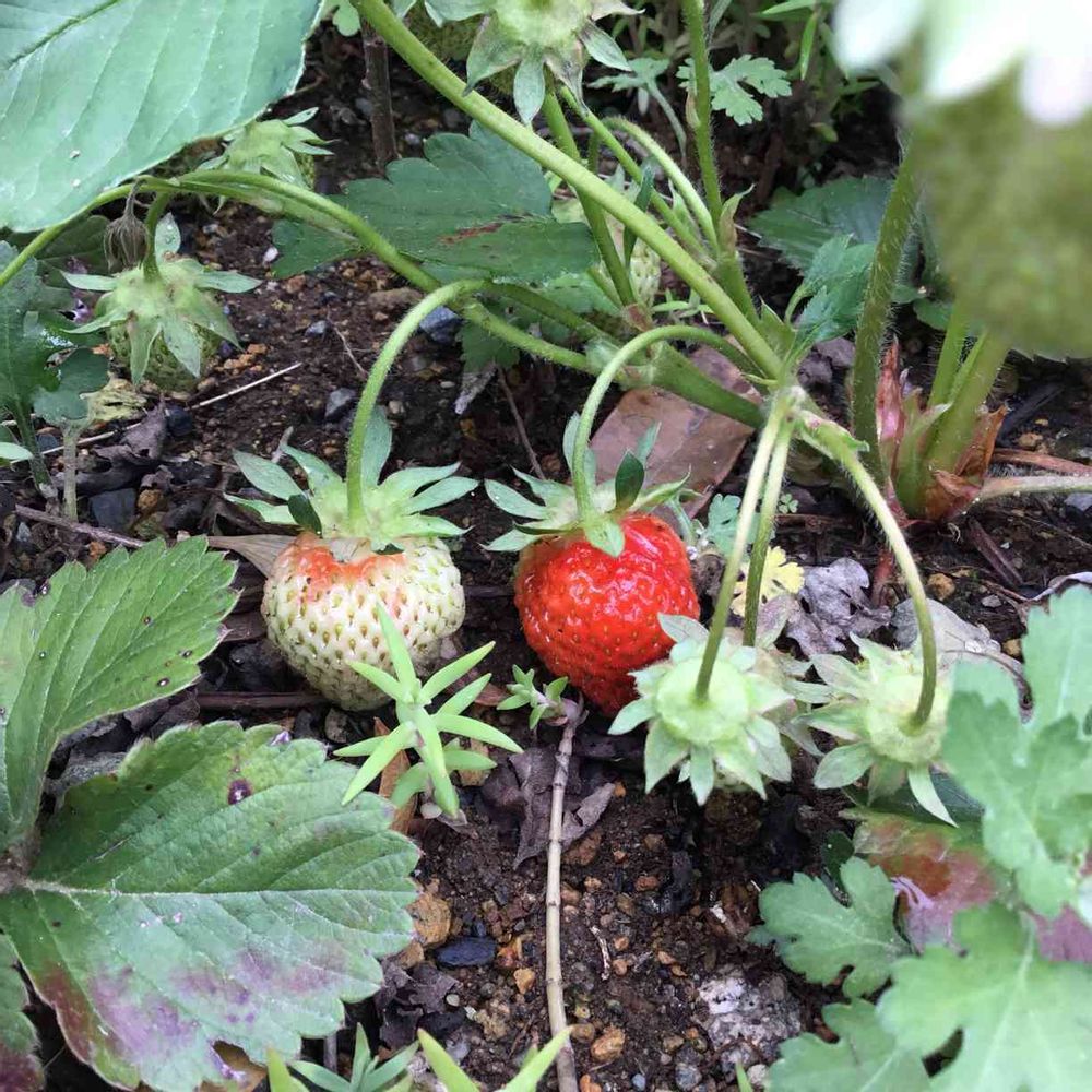 去年庭に直植えしたイチゴがランナーで増えてたくさん実をつけてくれてます。