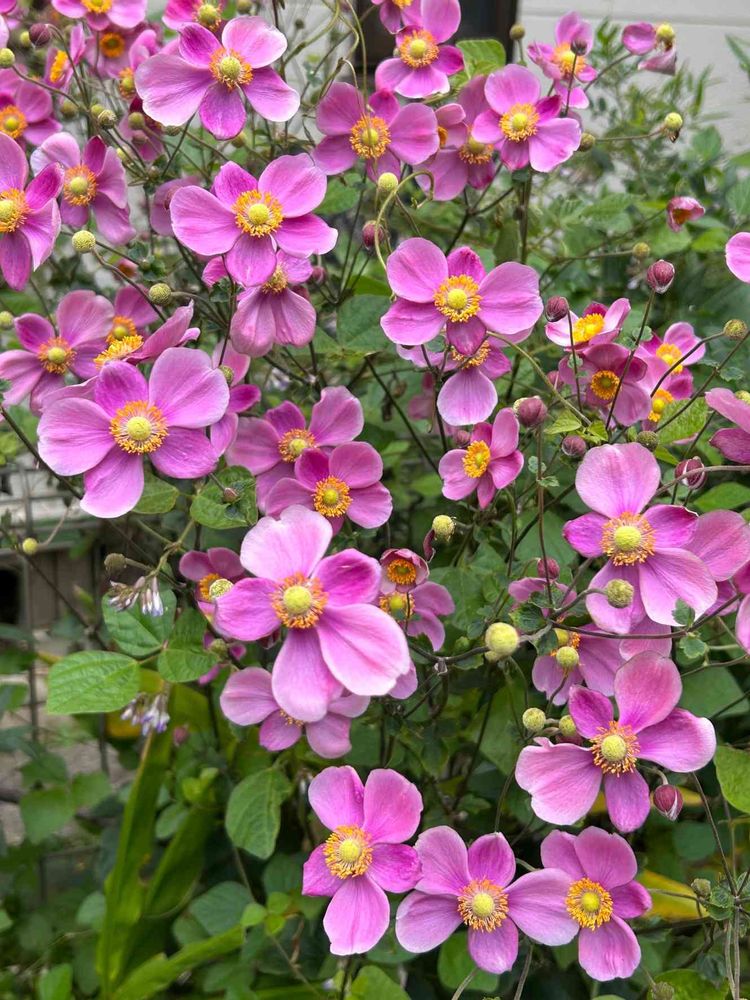 お隣のフェンス外に咲くピンク色の秋明菊。見事にいっぱい花を咲かせています。同じピンク系の秋明菊でも、我が家のとは雰囲気がだいぶ違いますね。