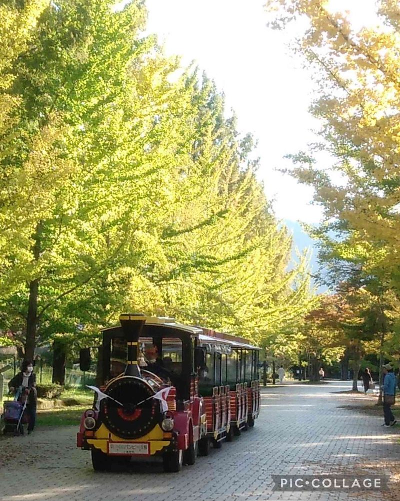 このイチョウ並木💛と園内を、移動乗用出来る機関車型の乗り物🚃が絵になるみたいですネ!