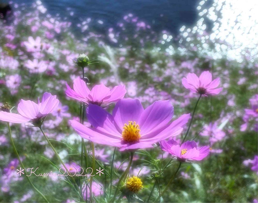 遠くのコスモスのぼかし具合と、川面のキラキラ✨がいい感じですね🎵