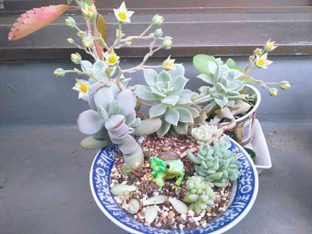 ちょんぱした元株を植えたり葉挿しを置き去りにする鉢。カエルが守ってくれてます。