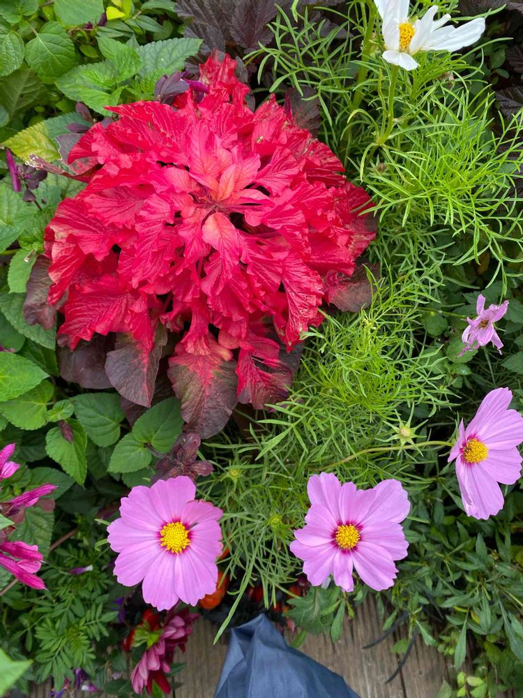赤い花?葉?は初めて見ました。コスモスとのコラボです。