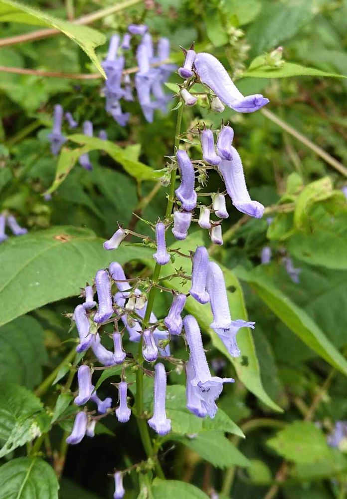 シソ科ヤマハッカ属の多年草。山地の木陰に生える。葉は対生し、短い柄があり、長さ5~15㎝の長楕円形で低い鋸歯があり、裏面には細かい毛がある。花期は9~10月。枝先や葉腋から花序を出し、細長い花柄の先にやや総状に青紫色の唇形花を多数つける。