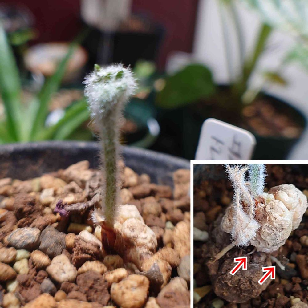 地上に半分ほど出してた芋の地際の辺りから根→が出てました🙌 春に出たけど夏には枯れた芽を切って、芋は地中の方が多いようなので少し出すだけにして深めに植え直しました👌