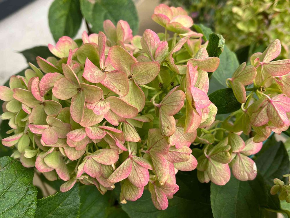 遅咲きのピラミッドアジサイの花びらが緑からピンクに色付いて綺麗です💚🧡💚🧡