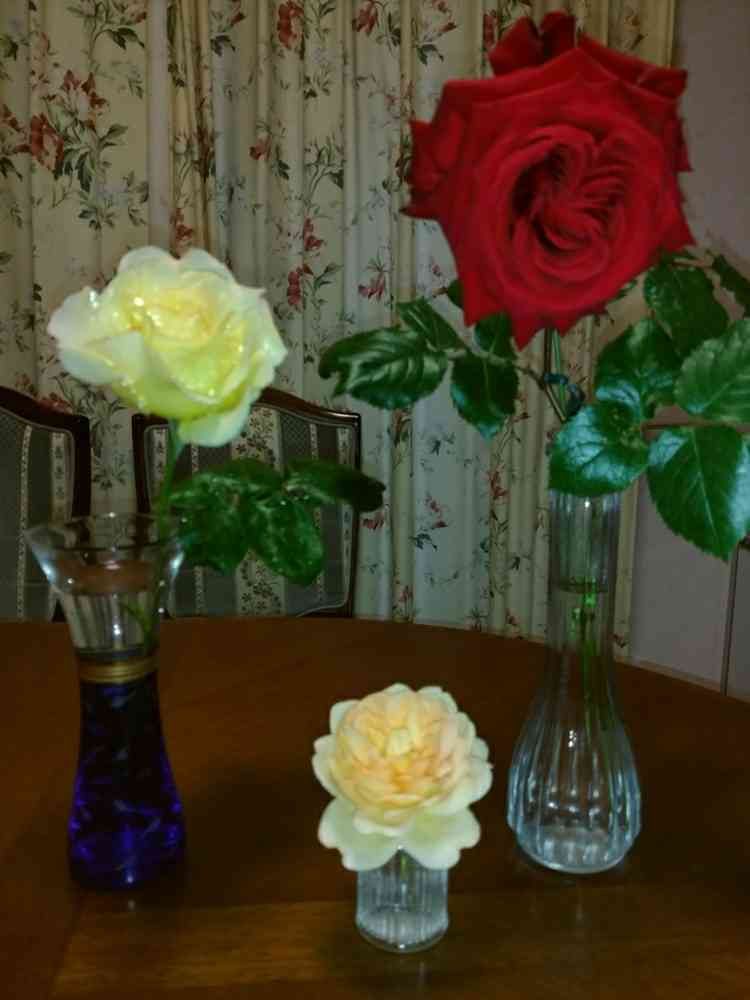 雨が酷いので、ピースとゴールデン・セレブレーションは、今日咲いたばかりですが、カットして一輪挿しに入れました。