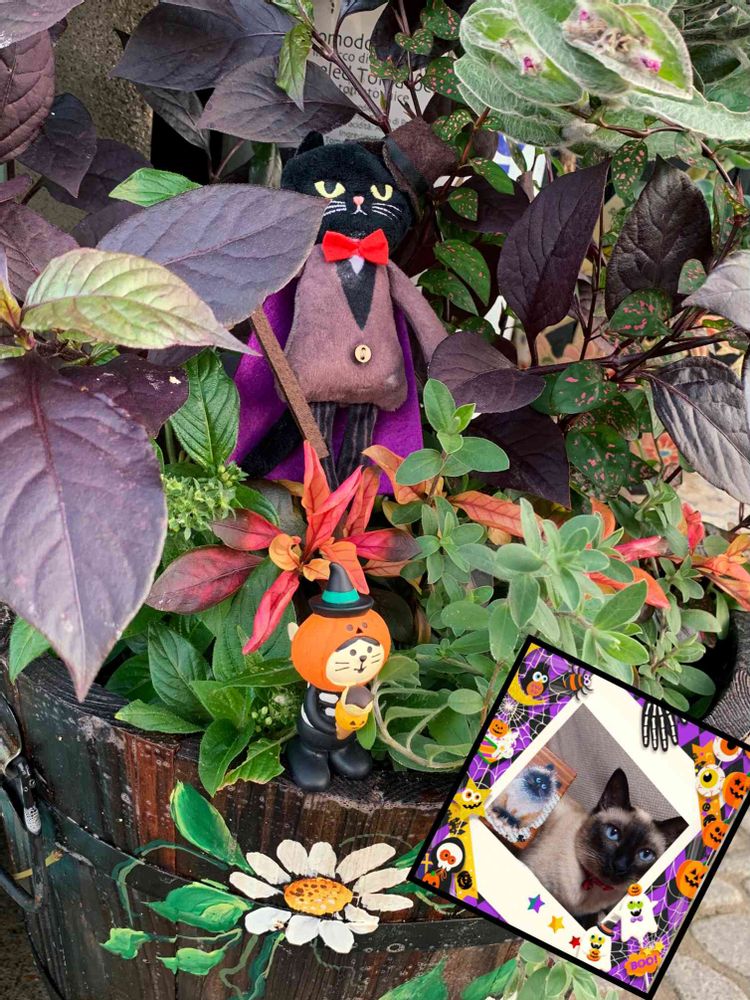 Dandyな黒猫ちゃん♥秋寄植えした鉢にお花🌼描いたのかな~良い感じに纏まってて素敵なハロウィン🎃だニャン(ΦωΦ)
