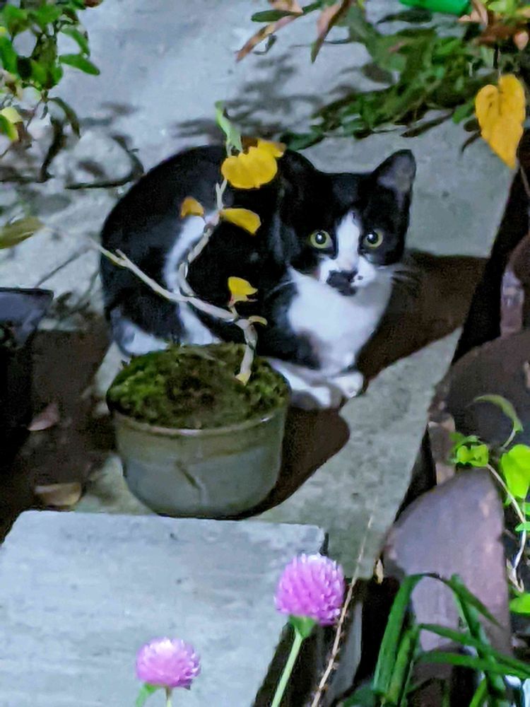 たまに夜になると庭に遊びに来る野良ニャンコ🤩私を見つけて『何してんだよ!』ゼンカイでこっちをみてる……😅