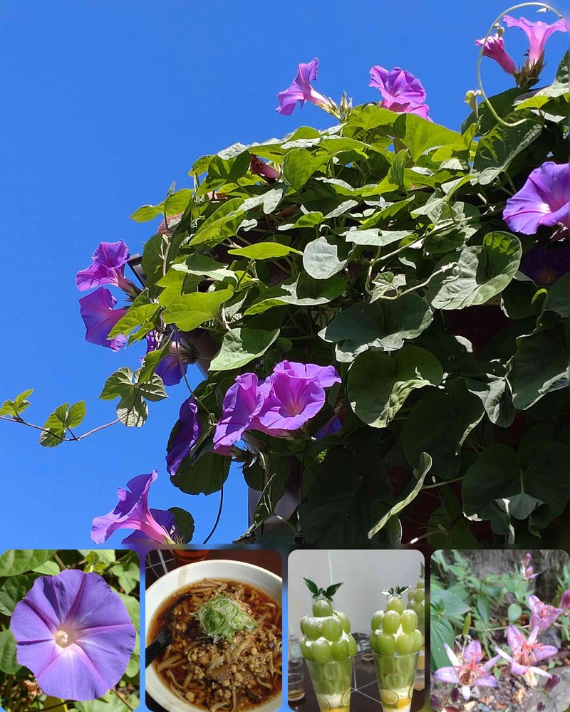 素晴らしい青空に向かって元気よく咲く朝顔💙