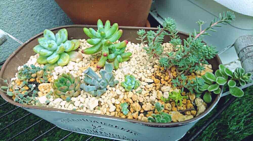 pipiちゃんに頂いたセダムと、一年中軒下で育てられる多肉さん達を選んで寄せたつもりです☺️