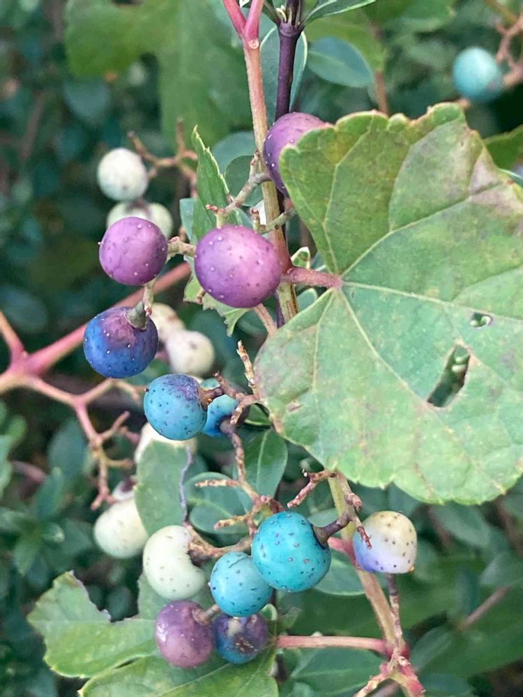標高が300m以上低い市街地で、家の周りより綺麗に色変している野葡萄を見つけました💙💜