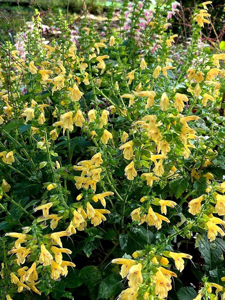 秋晴れ☀️の下賑やかに思い思いの方を向いて咲いているキバナアキギリ💛のお花が楽しそうです😊🎶(主人撮影🙏)