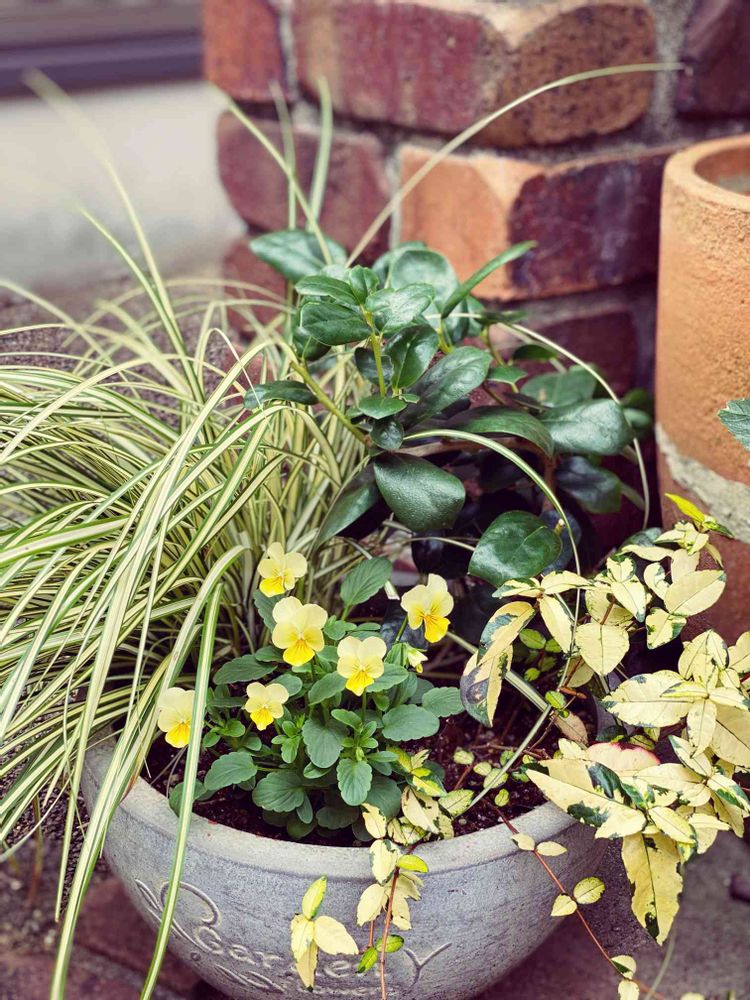 前からあるクリスマスホーリーとテイカ葛の寄植えにビオラを追加💠