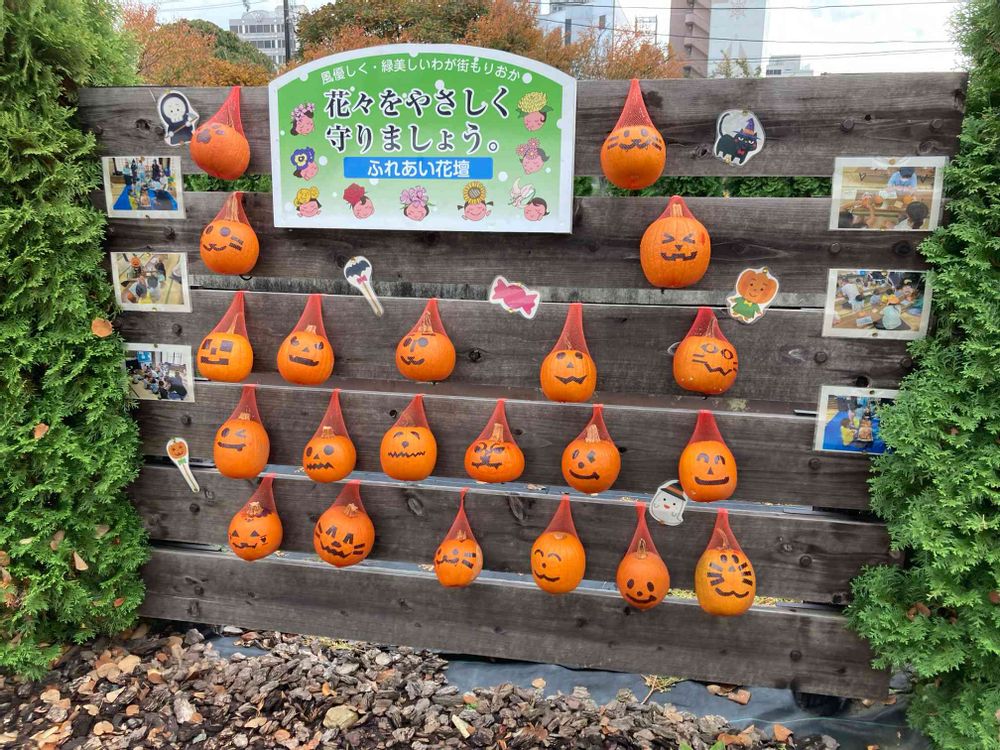 盛岡市内の小学生が、収穫したカボチャ🎃に顔を描いて、もりおか歴史文化センター前の敷地に飾ってありました👍