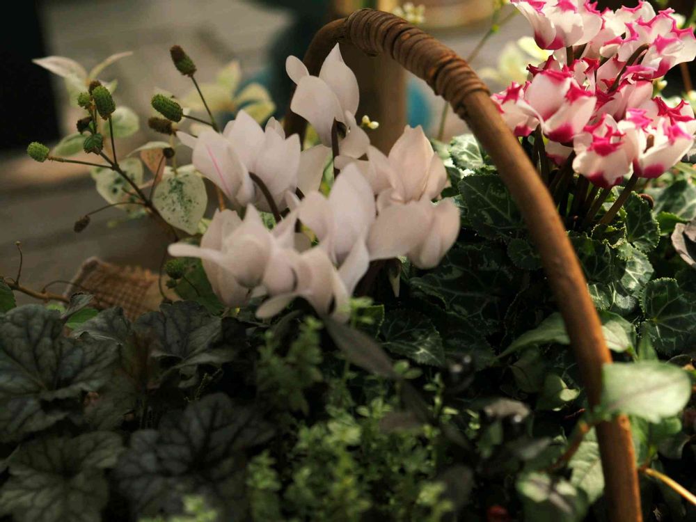 ガーデンシクラメン、ハツユキカズラ、ヒューケラ✨冬を彩るアイテムが、ナチュラルな籠に詰め込んであってかわいい🥰
