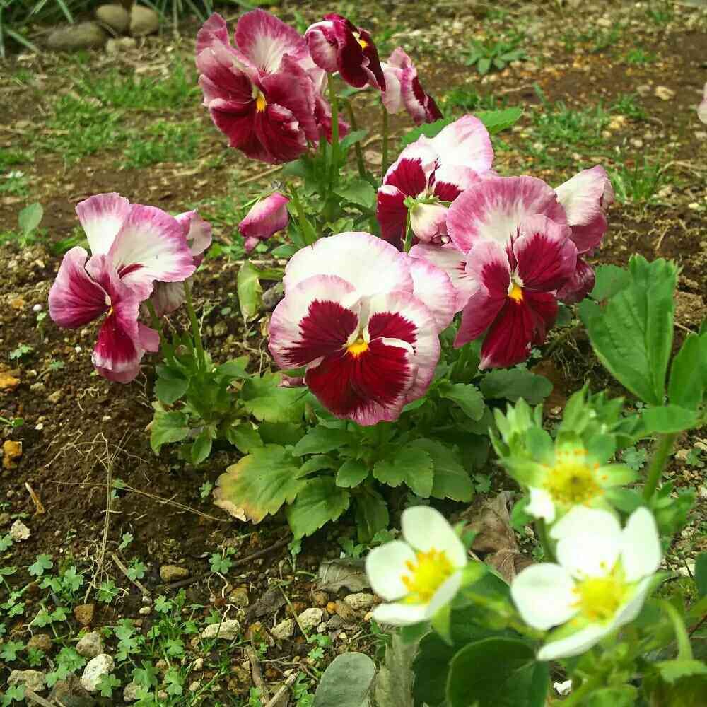 パンジー、昨年の秋に赤と白を並べて植えていたら…こんな感じになっちゃった💦