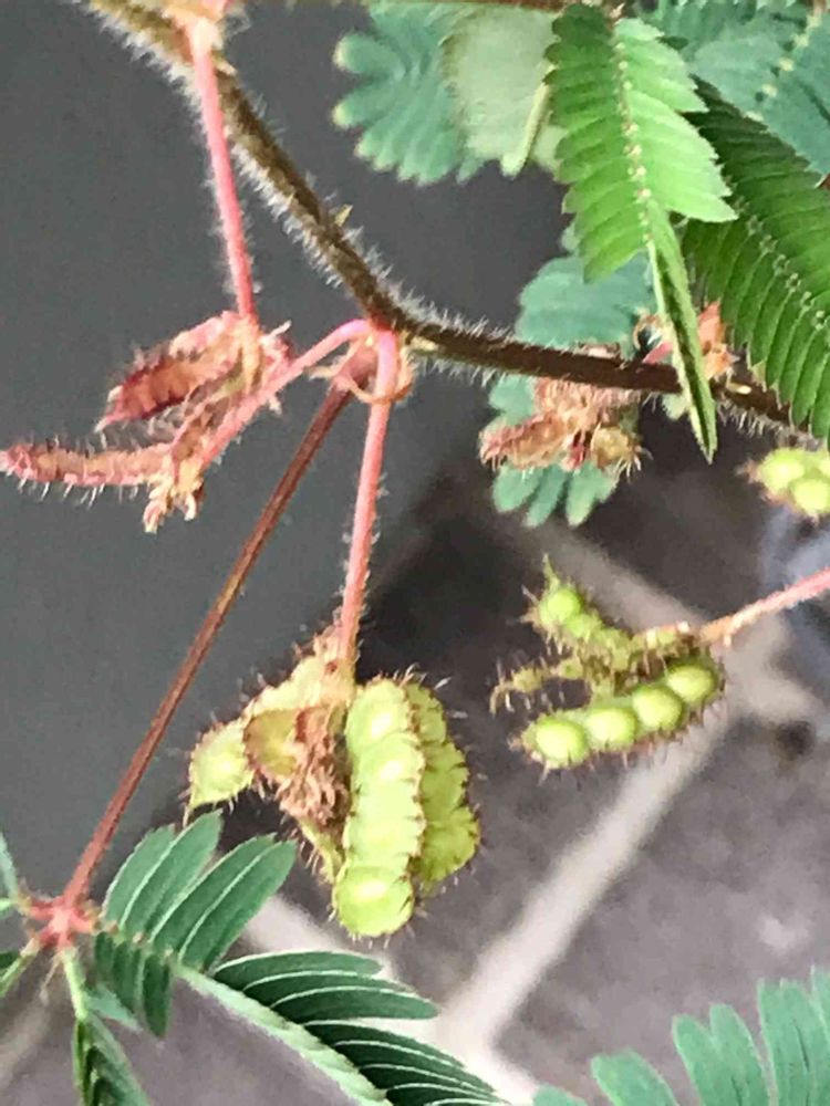 道沿いのお宅。オジギソウに種子が出来ています。鞘には棘が一周グルっと付いています。