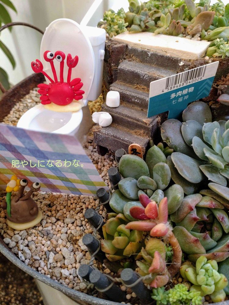 いい感じの?寄せ植えですね♪カニ🦀さんのトイレ🚽トイレットペーパー🧻は粘土細工ですか?芸が細かい!作りたい☺️