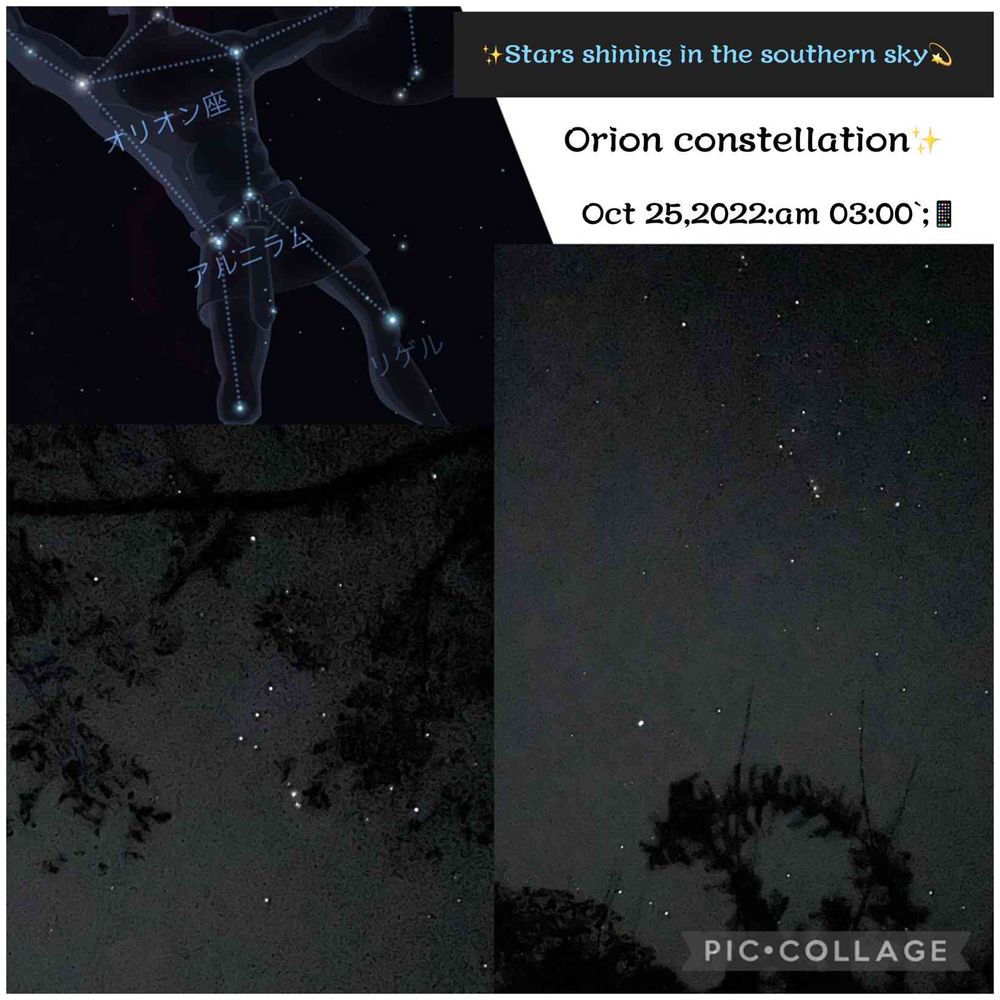 📝この写真画像は、今朝10月25日午前3時頃の南の天中に輝くオリオン座の3連星✨✨✨ Orion's Beltのセンター星: Epsilon Orionis. オリオン座ε星;Alnilam:アルニラムの星たちを中心に📱shootingしたものデス🐶