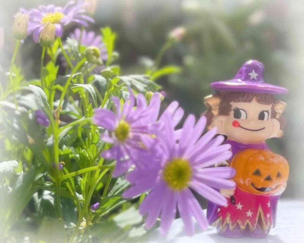 仮装のハロウィン🧙♀️ペコちゃんと、ブラキカムのお花のカラー💜がピッタリで٩̋(๑˃́ꇴ˂̀๑)カワイイ〜❥︎・•