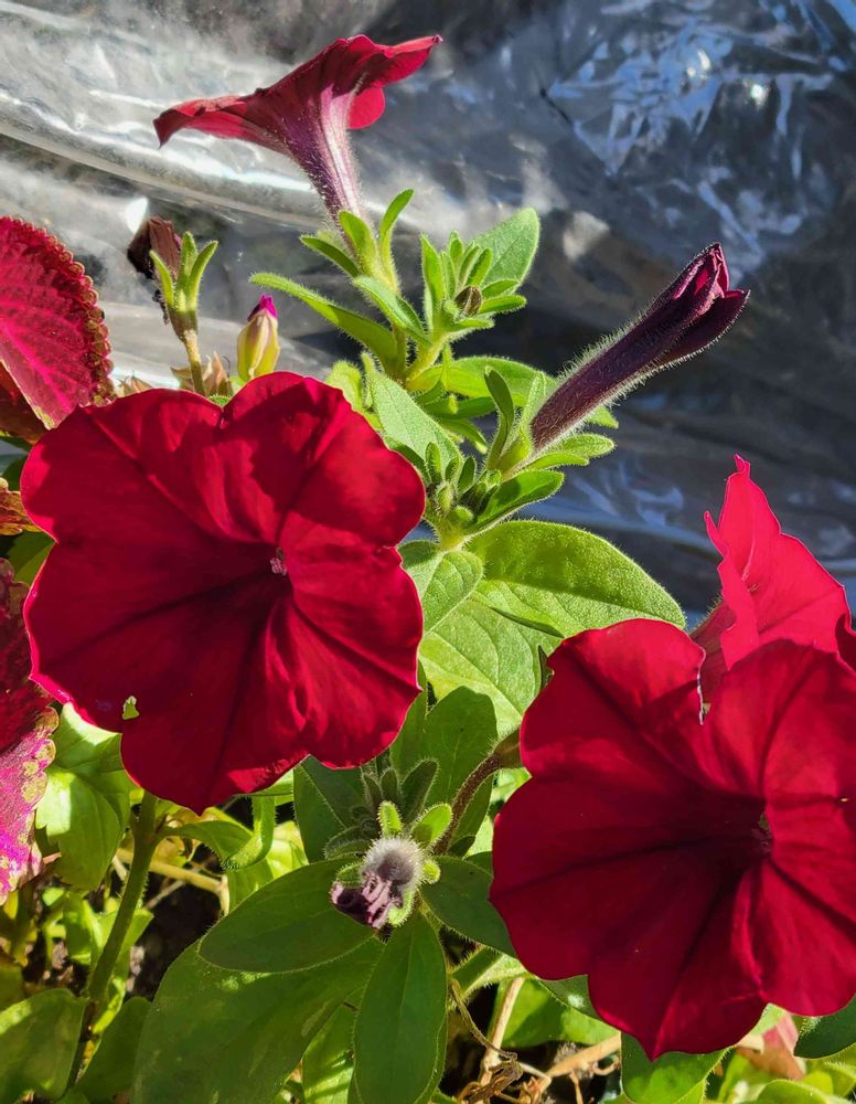 朝陽を浴びて綺麗真っ赤なペチュニア